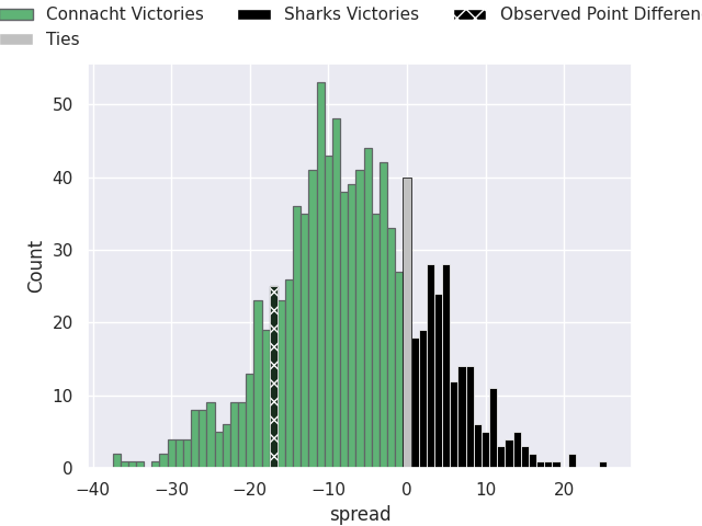 Now that the game has been played, lets see how the club predictions did. I predicted Connacht to win by 4.57, and Connacht won by 17.0. That’s an absolute error of 12.4 for the margin of victory, while my average absolute error has been 13.5 over the past six months. This prediction was more accurate than 41.9% of my recent predictions.