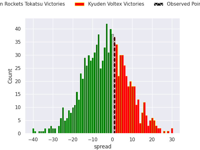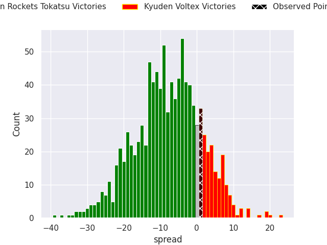 With the player model, I predicted Green Rockets Tokatsu to win by 3.56, and Kyuden Voltex won by 1.0. That’s an absolute error of 4.6 for the margin of victory, while the average error as been 13.3 for the past six months. So this prediction was more accurate than 63.4% of my recent predictions.