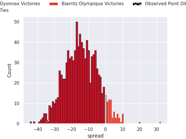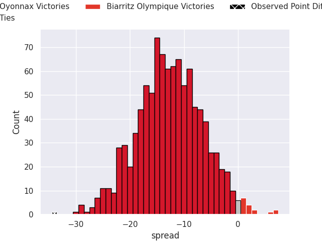 Now that the game has been played, lets see how the club predictions did. I predicted Oyonnax to win by 12.57, and Oyonnax won by 34.0. That’s an absolute error of 21.4 for the margin of victory, while my average absolute error has been 13.5 over the past six months. This prediction was more accurate than 20.6% of my recent predictions.