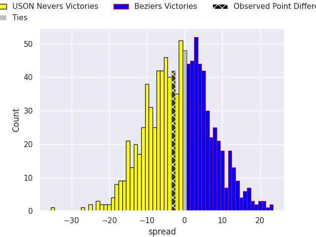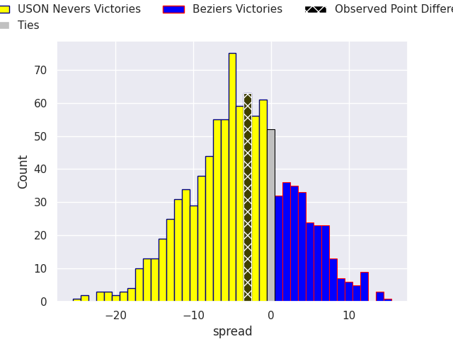 With the player model, I predicted USON Nevers to win by 1.38, and USON Nevers won by 3.0. That’s an absolute error of 1.6 for the margin of victory, while the average error as been 13.3 for the past six months. So this prediction was more accurate than 76.7% of my recent predictions.