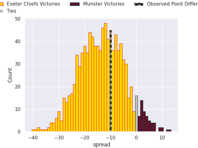 Now that the game has been played, lets see how the club predictions did. I predicted Exeter Chiefs to win by 11.54, and Exeter Chiefs won by 10.0. That’s an absolute error of 1.5 for the margin of victory, while my average absolute error has been 13.5 over the past six months. This prediction was more accurate than 90.9% of my recent predictions.