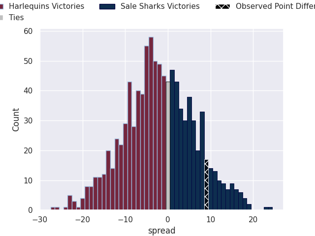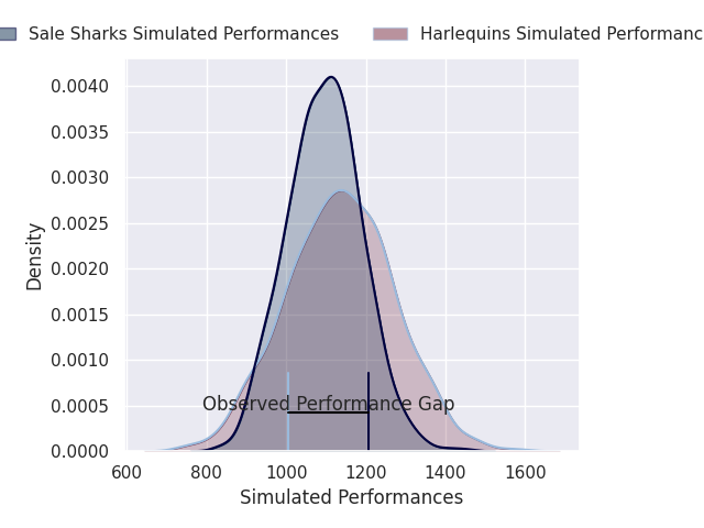 Now that the game has been played, lets see how the club predictions did. I predicted Harlequins to win by 3.29, and Sale Sharks won by 9.0. That’s an absolute error of 12.3 for the margin of victory, while my average absolute error has been 13.5 over the past six months. This prediction was more accurate than 42.3% of my recent predictions.