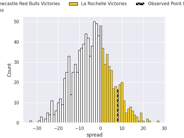 Now that the game has been played, lets see how the club predictions did. I predicted La Rochelle to win by 4.14, and La Rochelle won by 8.0. That’s an absolute error of 3.9 for the margin of victory, while my average absolute error has been 13.5 over the past six months. This prediction was more accurate than 80.7% of my recent predictions.