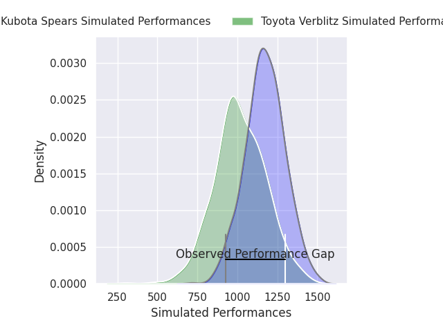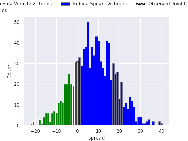 Now that the game has been played, lets see how the club predictions did. I predicted Kubota Spears to win by 13.57, and Toyota Verblitz won by 17.0. That’s an absolute error of 30.6 for the margin of victory, while my average absolute error has been 13.5 over the past six months. This prediction was more accurate than 9.7% of my recent predictions.