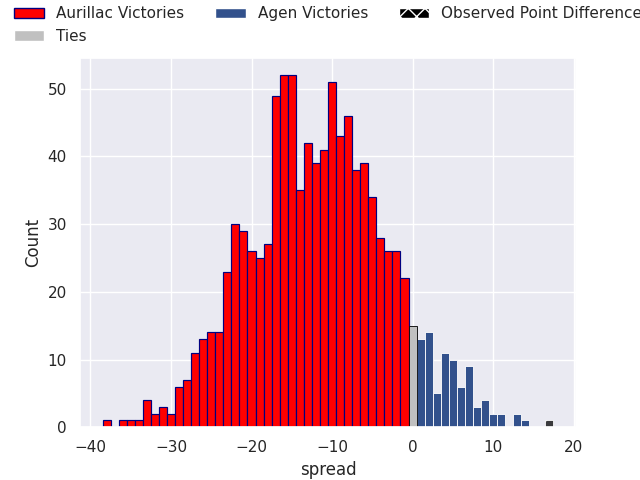 Now that the game has been played, lets see how the club predictions did. I predicted Aurillac to win by 3.34, and Agen won by 17.0. That’s an absolute error of 20.3 for the margin of victory, while my average absolute error has been 13.7 over the past six months. This prediction was more accurate than 22.7% of my recent predictions.