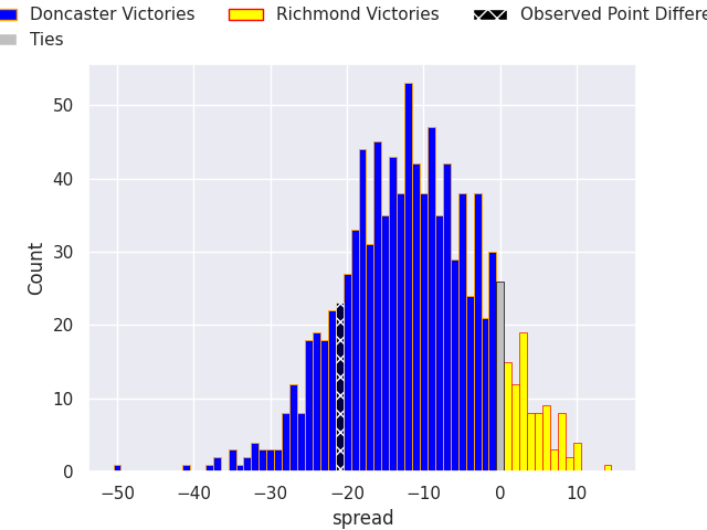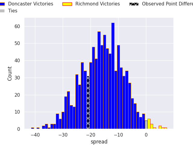 With the player model, I predicted Doncaster to win by 11.42, and Doncaster won by 21.0. That’s an absolute error of 9.6 for the margin of victory, while the average error as been 13.9 for the past six months. So this prediction was more accurate than 49.0% of my recent predictions.