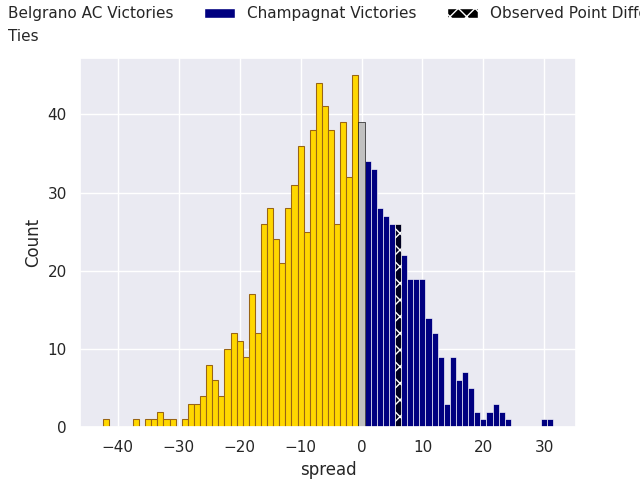 Now that the game has been played, lets see how the club predictions did. I predicted Belgrano AC to win by 11.94, and Champagnat won by 6.0. That’s an absolute error of 17.9 for the margin of victory, while my average absolute error has been 13.7 over the past six months. This prediction was more accurate than 27.7% of my recent predictions.