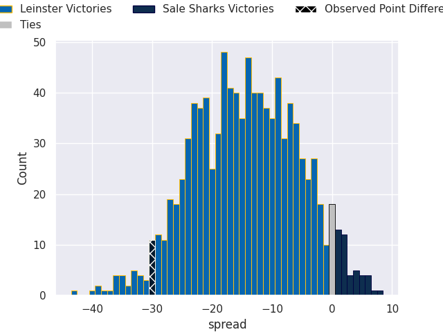 With the player model, I predicted Leinster to win by 14.35, and Leinster won by 30.0. That’s an absolute error of 15.6 for the margin of victory, while the average error as been 13.9 for the past six months. So this prediction was more accurate than 30.2% of my recent predictions.