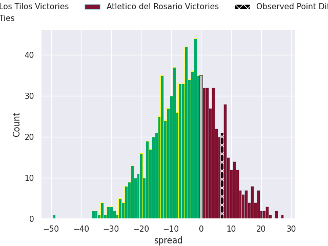 With the player model, I predicted Los Tilos to win by 4.68, and Atletico del Rosario won by 7.0. That’s an absolute error of 11.7 for the margin of victory, while the average error as been 13.9 for the past six months. So this prediction was more accurate than 40.9% of my recent predictions.