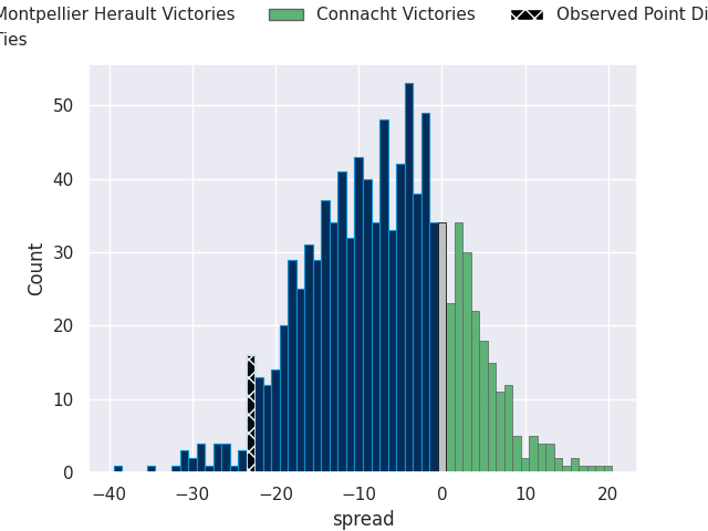 Now that the game has been played, lets see how the club predictions did. I predicted Montpellier Herault to win by 9.95, and Montpellier Herault won by 23.0. That’s an absolute error of 13.0 for the margin of victory, while my average absolute error has been 13.7 over the past six months. This prediction was more accurate than 41.2% of my recent predictions.