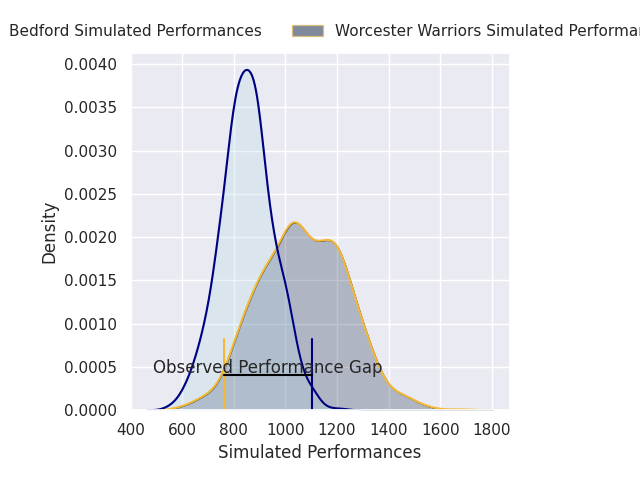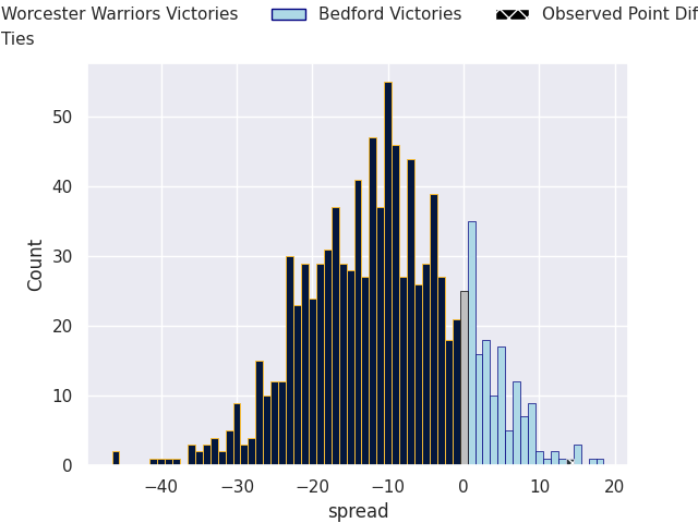 Now that the game has been played, lets see how the club predictions did. I predicted Worcester Warriors to win by 8.02, and Bedford won by 14.0. That’s an absolute error of 22.0 for the margin of victory, while my average absolute error has been 13.7 over the past six months. This prediction was more accurate than 20.1% of my recent predictions.