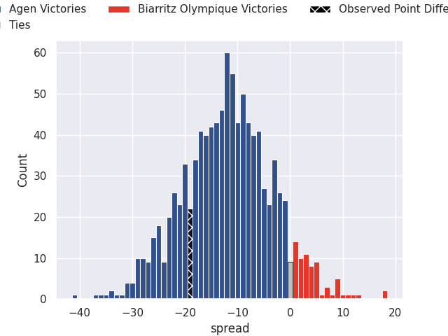 Now that the game has been played, lets see how the club predictions did. I predicted Agen to win by 8.29, and Agen won by 19.0. That’s an absolute error of 10.7 for the margin of victory, while my average absolute error has been 13.8 over the past six months. This prediction was more accurate than 48.9% of my recent predictions.