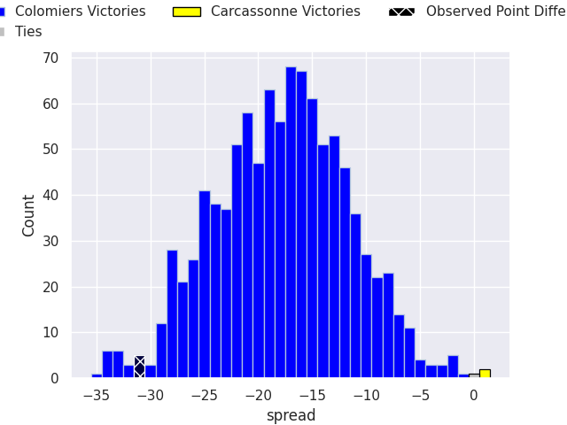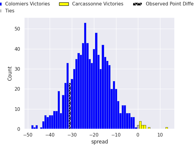 With the player model, I predicted Colomiers to win by 21.79, and Colomiers won by 31.0. That’s an absolute error of 9.2 for the margin of victory, while the average error as been 13.9 for the past six months. So this prediction was more accurate than 49.5% of my recent predictions.