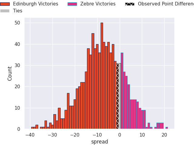 Now that the game has been played, lets see how the club predictions did. I predicted Edinburgh to win by 10.1, and Edinburgh won by 1.0. That’s an absolute error of 9.1 for the margin of victory, while my average absolute error has been 13.8 over the past six months. This prediction was more accurate than 55.6% of my recent predictions.