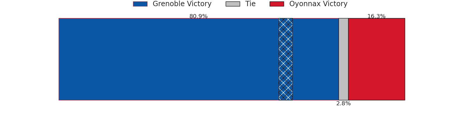 Now that the game has been played, lets see how the club predictions did. I predicted Grenoble to win by 0.74, and Grenoble won by 5.0. That’s an absolute error of 4.3 for the margin of victory, while my average absolute error has been 13.8 over the past six months. This prediction was more accurate than 78.4% of my recent predictions.