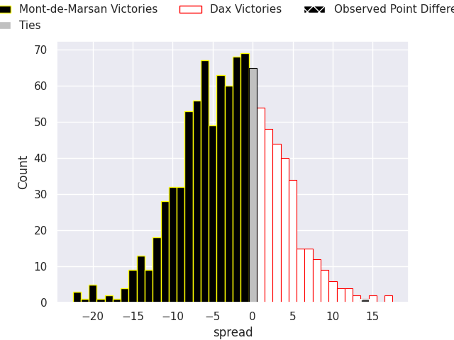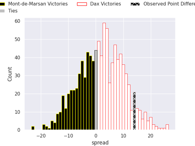 Now that the game has been played, lets see how the club predictions did. I predicted Mont-de-Marsan to win by 2.75, and Dax won by 14.0. That’s an absolute error of 16.8 for the margin of victory, while my average absolute error has been 13.8 over the past six months. This prediction was more accurate than 30.8% of my recent predictions.
