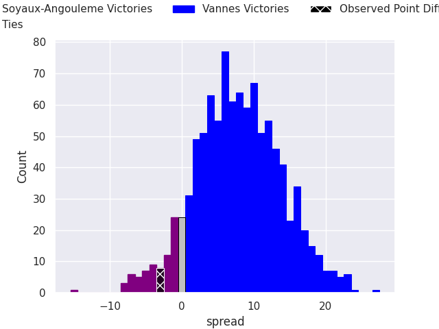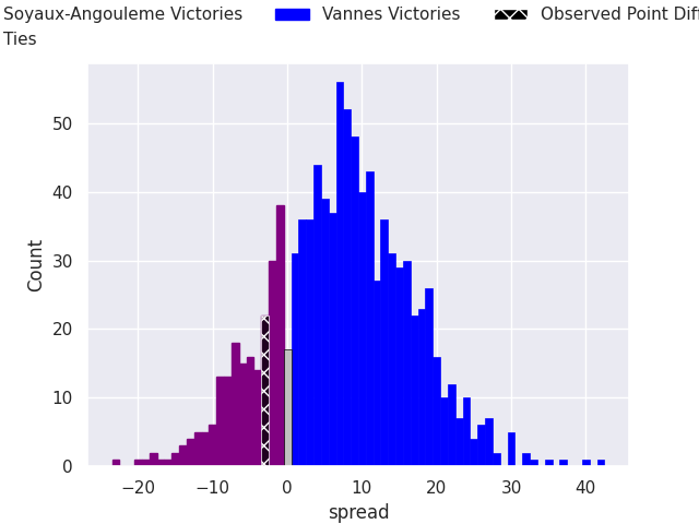 Now that the game has been played, lets see how the club predictions did. I predicted Vannes to win by 7.86, and Soyaux-Angouleme won by 3.0. That’s an absolute error of 10.9 for the margin of victory, while my average absolute error has been 13.8 over the past six months. This prediction was more accurate than 48.1% of my recent predictions.