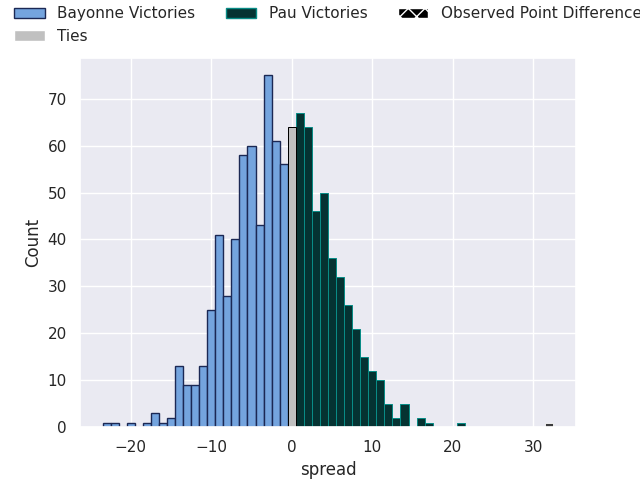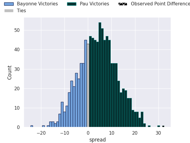 Now that the game has been played, lets see how the club predictions did. I predicted Bayonne to win by 1.23, and Pau won by 32.0. That’s an absolute error of 33.2 for the margin of victory, while my average absolute error has been 13.8 over the past six months. This prediction was more accurate than 7.6% of my recent predictions.