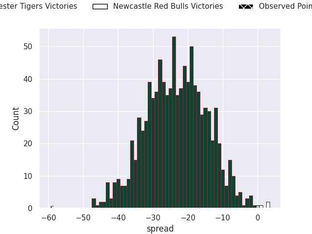 Now that the game has been played, lets see how the club predictions did. I predicted Leicester Tigers to win by 20.29, and Leicester Tigers won by 59.0. That’s an absolute error of 38.7 for the margin of victory, while my average absolute error has been 13.8 over the past six months. This prediction was more accurate than 5.3% of my recent predictions.