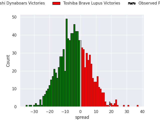 With the player model, I predicted Mitsubishi Dynaboars to win by 3.98, and Toshiba Brave Lupus won by 19.0. That’s an absolute error of 23.0 for the margin of victory, while the average error as been 13.9 for the past six months. So this prediction was more accurate than 16.3% of my recent predictions.