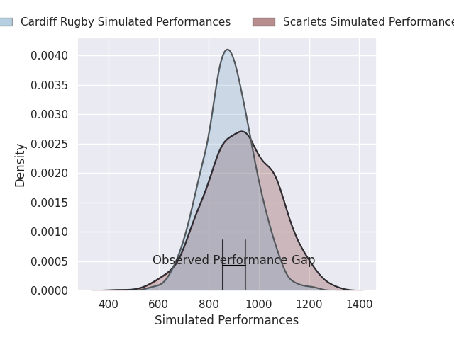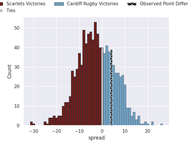 Now that the game has been played, lets see how the club predictions did. I predicted Scarlets to win by 3.01, and Cardiff Rugby won by 4.0. That’s an absolute error of 7.0 for the margin of victory, while my average absolute error has been 13.8 over the past six months. This prediction was more accurate than 64.1% of my recent predictions.