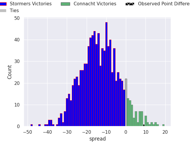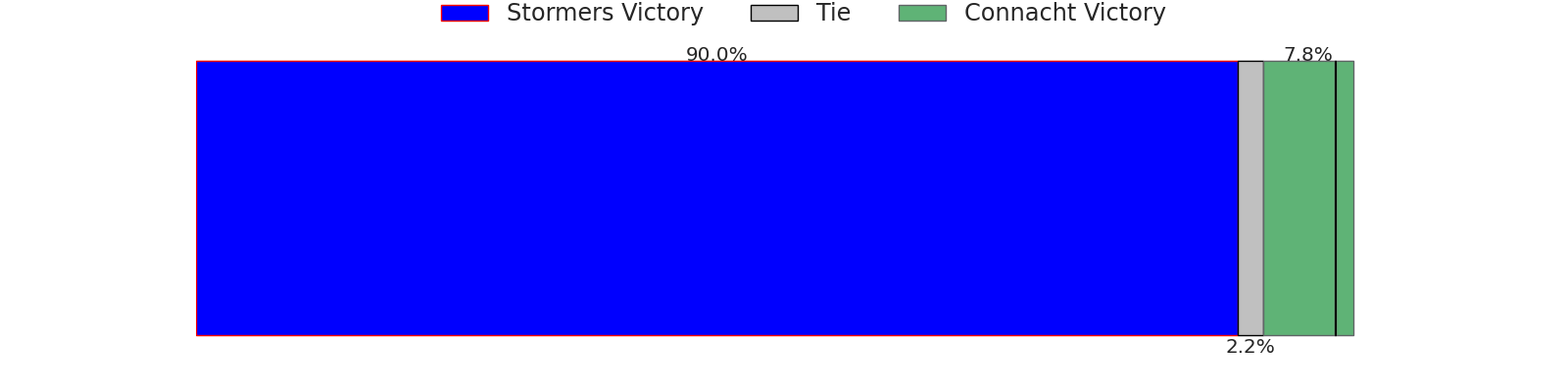 Now that the game has been played, lets see how the club predictions did. I predicted Stormers to win by 7.54, and Connacht won by 9.0. That’s an absolute error of 16.5 for the margin of victory, while my average absolute error has been 13.8 over the past six months. This prediction was more accurate than 31.2% of my recent predictions.