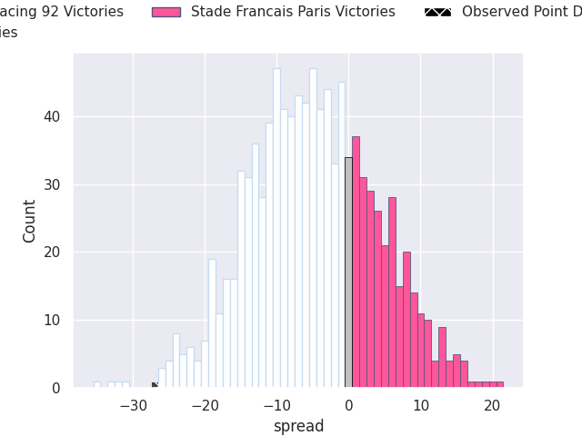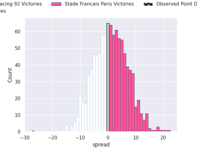 Now that the game has been played, lets see how the club predictions did. I predicted Stade Francais Paris to win by 0.93, and Racing 92 won by 27.0. That’s an absolute error of 27.9 for the margin of victory, while my average absolute error has been 13.8 over the past six months. This prediction was more accurate than 12.0% of my recent predictions.
