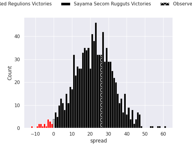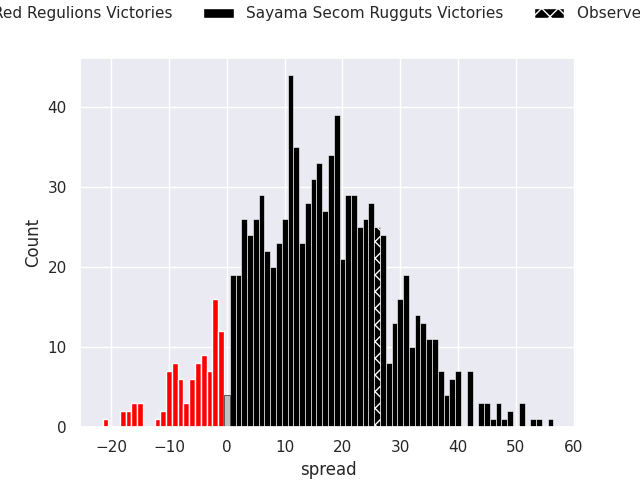 With the player model, I predicted Sayama Secom Rugguts to win by 15.78, and Sayama Secom Rugguts won by 26.0. That’s an absolute error of 10.2 for the margin of victory, while the average error as been 14.0 for the past six months. So this prediction was more accurate than 45.1% of my recent predictions.