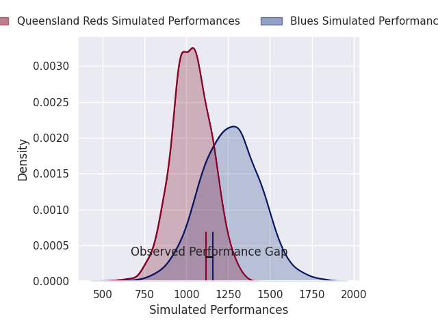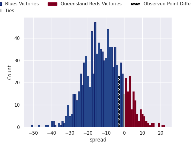 Now that the game has been played, lets see how the club predictions did. I predicted Blues to win by 12.09, and Blues won by 3.0. That’s an absolute error of 9.1 for the margin of victory, while my average absolute error has been 14.0 over the past six months. This prediction was more accurate than 56.0% of my recent predictions.