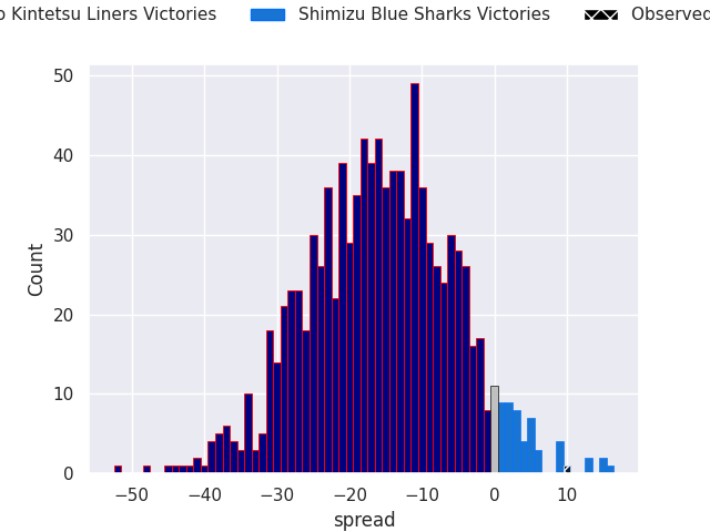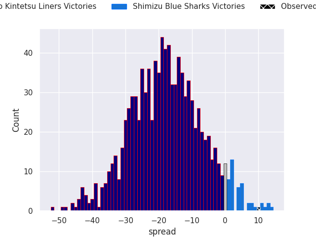 With the player model, I predicted Hanazono Kintetsu Liners to win by 17.82, and Shimizu Blue Sharks won by 10.0. That’s an absolute error of 27.8 for the margin of victory, while the average error as been 14.0 for the past six months. So this prediction was more accurate than 11.4% of my recent predictions.
