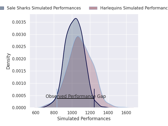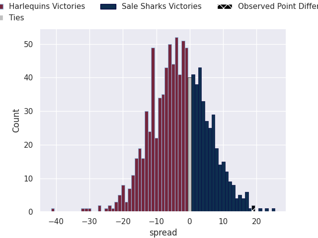 Now that the game has been played, lets see how the club predictions did. I predicted Harlequins to win by 2.98, and Sale Sharks won by 19.0. That’s an absolute error of 22.0 for the margin of victory, while my average absolute error has been 14.0 over the past six months. This prediction was more accurate than 20.8% of my recent predictions.
