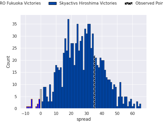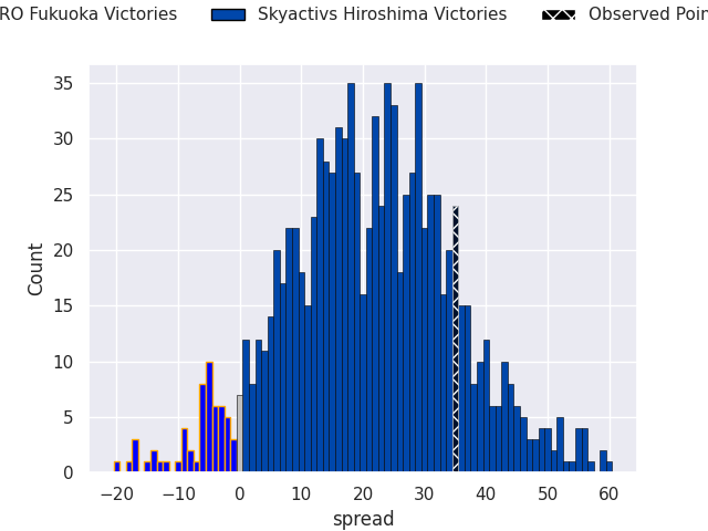 With the player model, I predicted Skyactivs Hiroshima to win by 21.15, and Skyactivs Hiroshima won by 35.0. That’s an absolute error of 13.8 for the margin of victory, while the average error as been 14.0 for the past six months. So this prediction was more accurate than 33.6% of my recent predictions.