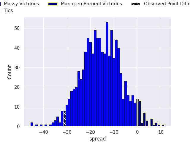 With the player model, I predicted Massy to win by 15.33, and Massy won by 31.0. That’s an absolute error of 15.7 for the margin of victory, while the average error as been 14.0 for the past six months. So this prediction was more accurate than 29.4% of my recent predictions.