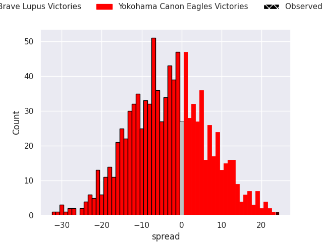 Now that the game has been played, lets see how the club predictions did. I predicted Toshiba Brave Lupus to win by 5.44, and Yokohama Canon Eagles won by 24.0. That’s an absolute error of 29.4 for the margin of victory, while my average absolute error has been 14.0 over the past six months. This prediction was more accurate than 11.8% of my recent predictions.