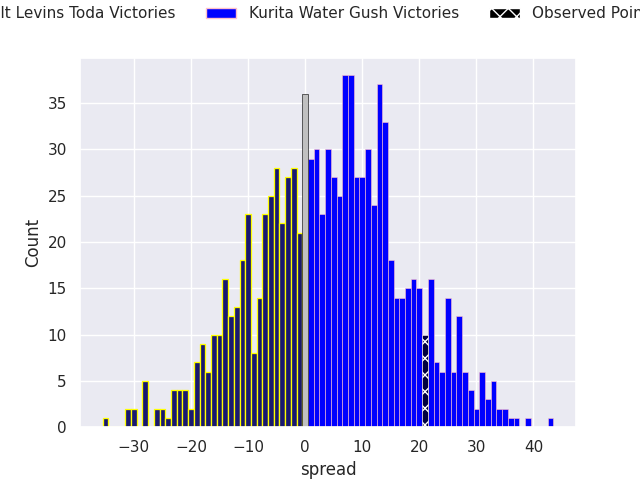 Now that the game has been played, lets see how the club predictions did. I predicted Kurita Water Gush to win by 4.32, and Kurita Water Gush won by 21.0. That’s an absolute error of 16.7 for the margin of victory, while my average absolute error has been 14.0 over the past six months. This prediction was more accurate than 31.4% of my recent predictions.